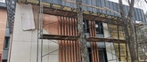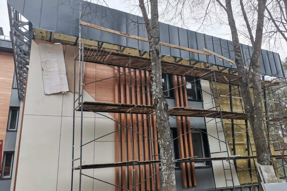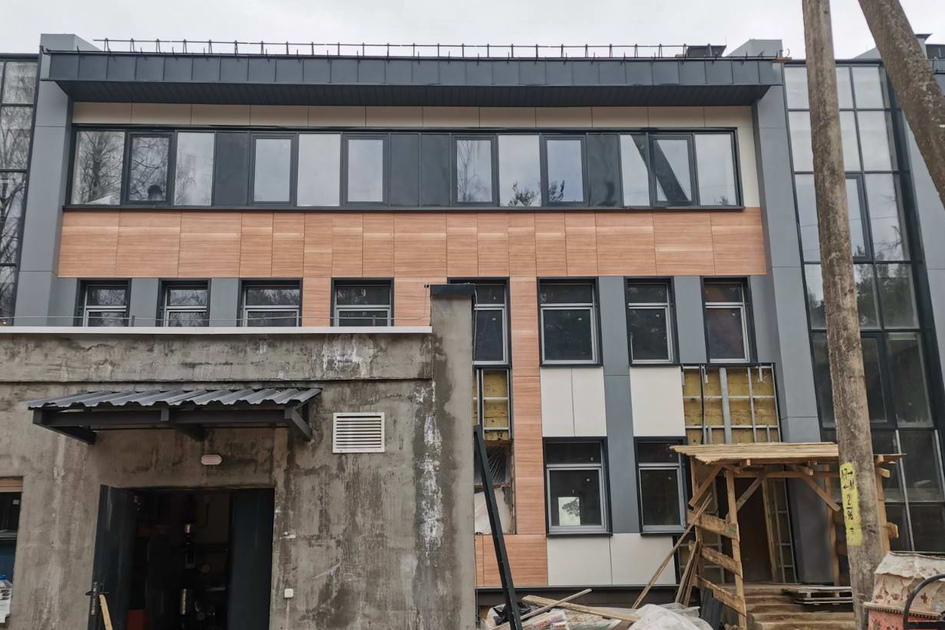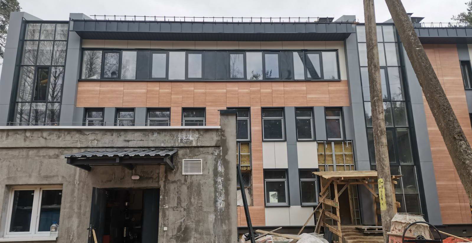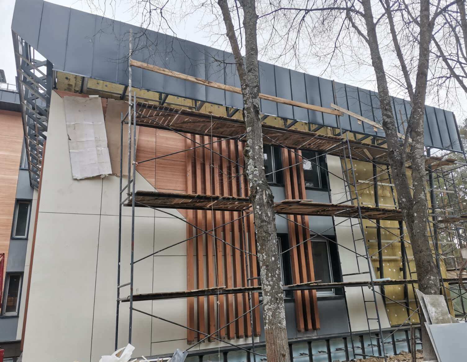 Вентфасад с облицовкой фиброцементыми панелями LTM (в том числе фактурой "под дерево"), фальцевых панелей из оцинкованной стали с полимерным покрытием