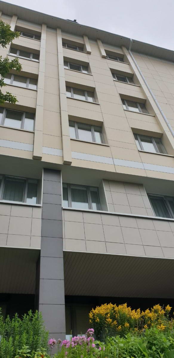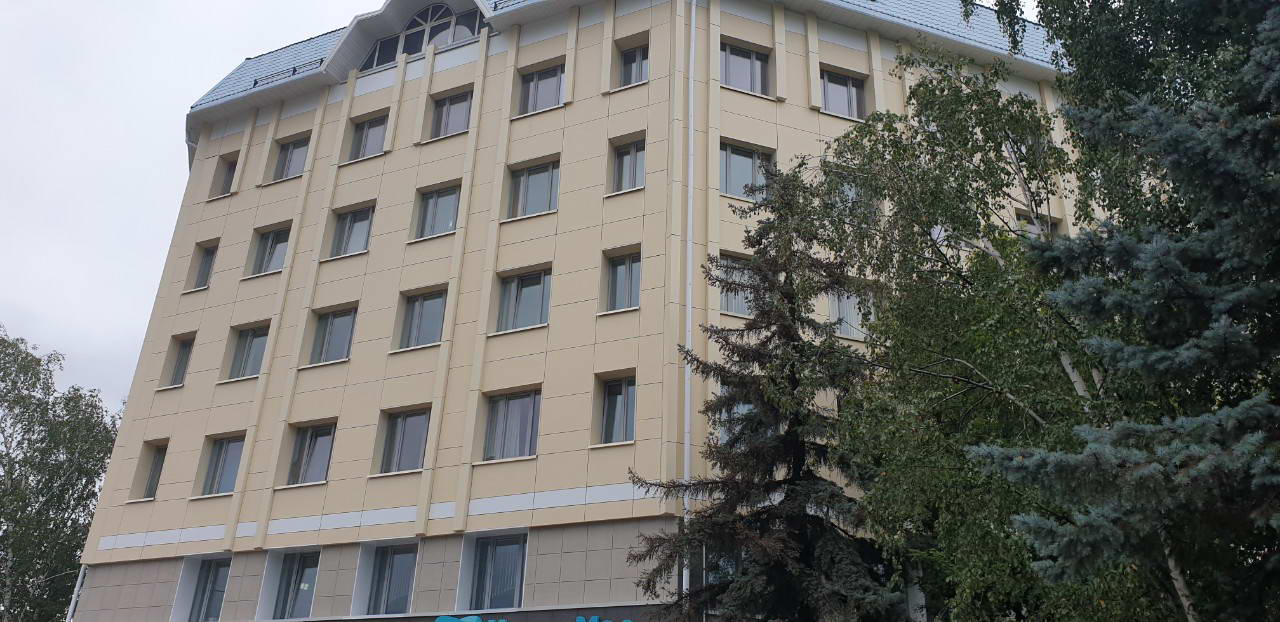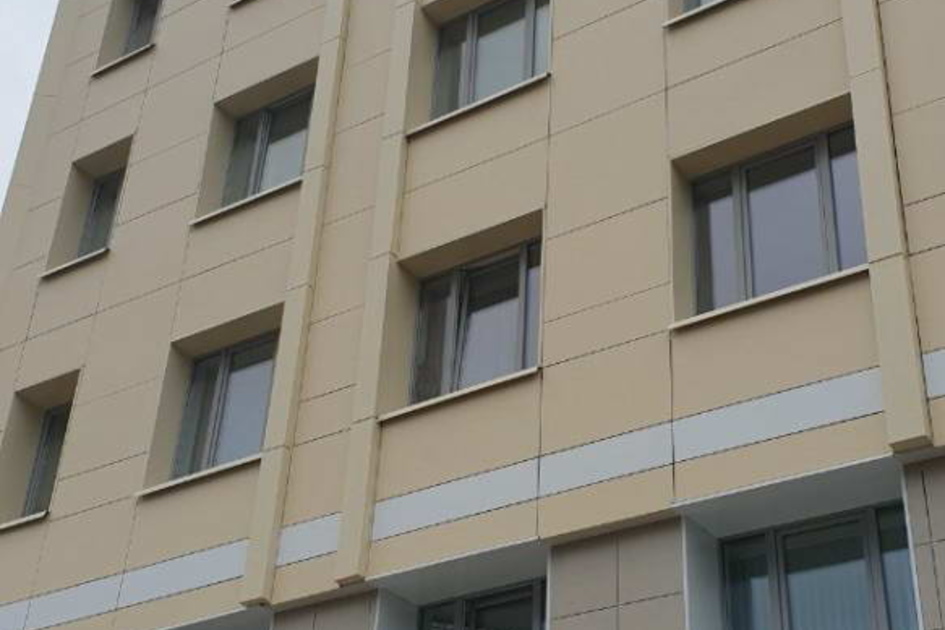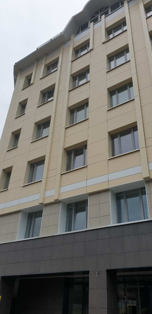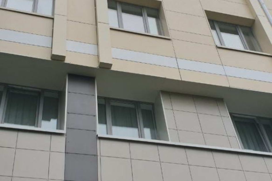 Облицовка кассетами из алюминиевых композитных панелей 400 м2, фиброцементными панелями 1200 м2, подсистема вертикально-горизонтальная, оцинкованная.